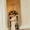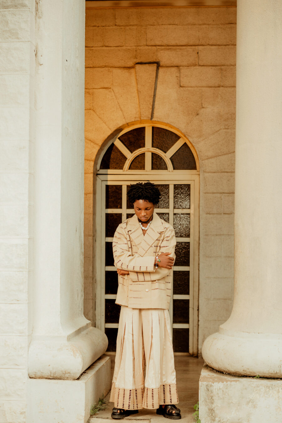 HAND CRAFTED TWO PIECE FEATURING A PERFORATED STRUCTURED DOUBLE BREASTED BLAZER AND WIDE PLEATED TROUSERS