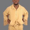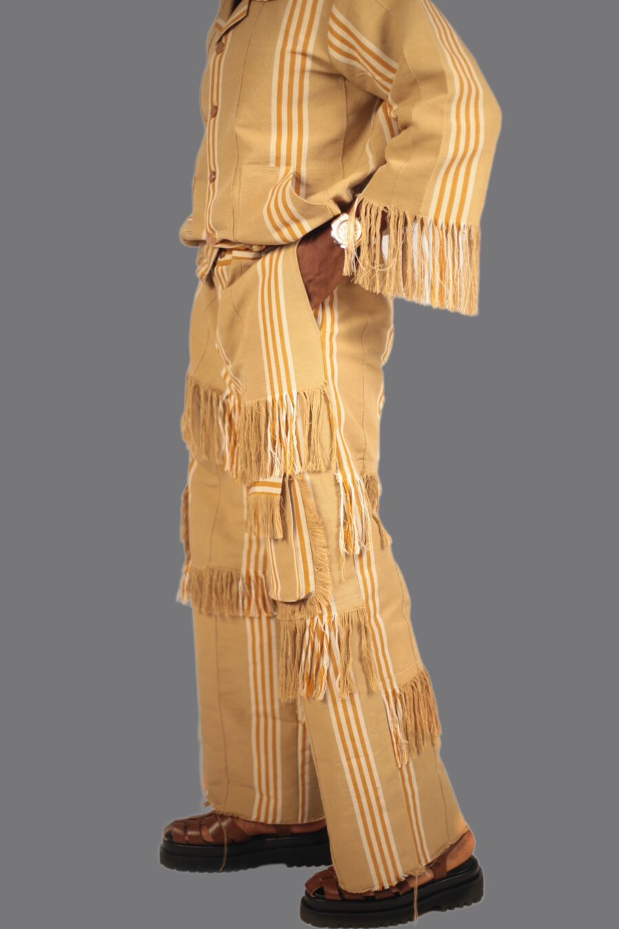 HANDWOVEN ASO OKEÂ RELAXED BUTTON UP SHIRT WITH CARGO STYLED TROUSERS WITH LAYERED FRINGE ACCENTS